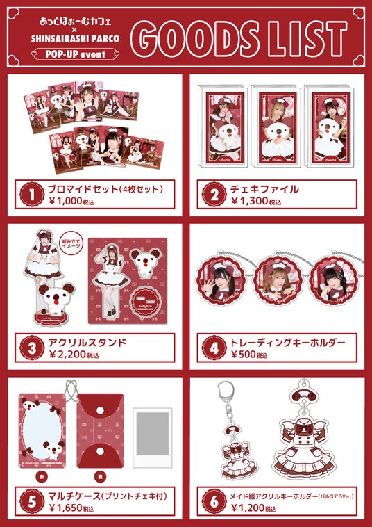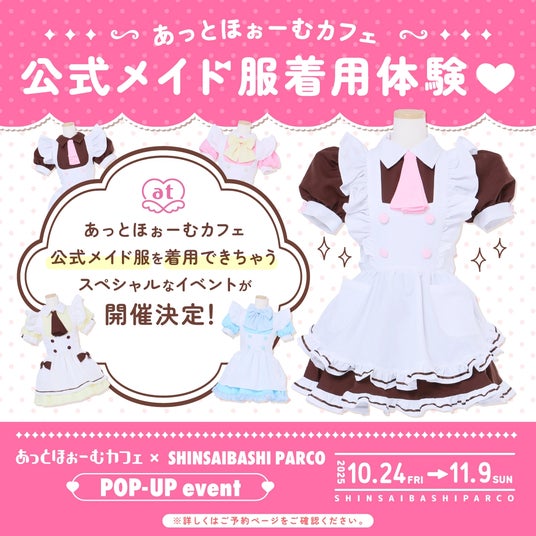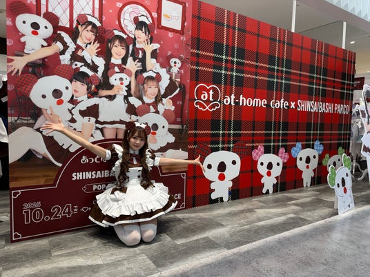 - 内容:あっとほぉーむカフェのスペシャルな展示(無料)/PARCO限定コラボグッズ販売/あっとほぉーむカフェ公式メイド服着用体験/「パルコアラ」柄の限定リボンを着用したメイドとのチェキ撮影会