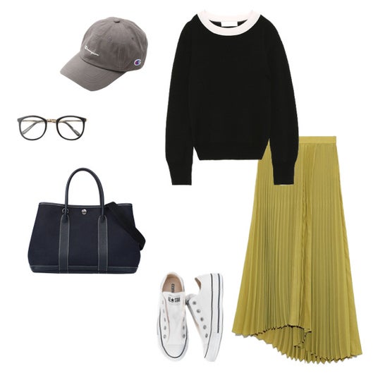 ブラックのニットとマスタードイエローのプリーツスカートを合わせ、秋らしいコントラストのある配色です。キャップとスニーカーを取り入れることで、程よく力の抜けたカジュアル感を演出しています。そこに「ガーデンパーティ」を加えることで、全体を大人っぽく引き締め、ラフになりすぎない印象に仕上がります。秋の週末ショッピングや、友人とのカフェ巡りなど、リラックスしつつ上品さも欲しいシーンにぴったりです。