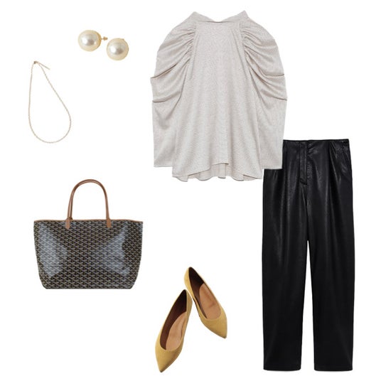 光沢感のあるブラックパンツに、ドレープの美しいトップスを合わせた大人の洗練スタイルです。サンルイPMが加わることで、ラグジュアリーな印象をさりげなくプラスしています。さらに、マスタードカラーのパンプスが秋らしい差し色となり、全体に季節感と華やかさを与えています。オフィスカジュアルから外出先での打ち合わせまで幅広く対応できます。信頼感と大人の余裕を演出できるオフィスコーデに仕上がります。