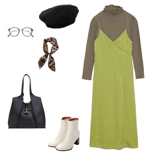 光沢のあるライムグリーンのキャミソールワンピースに、落ち着いたカーキのタートルネックカットソーをレイヤードします。異なる素材と色を組み合わせることで、秋らしいシックな雰囲気を演出しています。レオパード柄のスカーフとベレー帽で、コーディネートに遊び心と季節感をプラス、足元のオフホワイトのショートブーツは、重くなりがちな秋冬の装いに抜け感を与えます。そして、TOD'Sのブラックバッグが、旅先での荷物をしっかり収納しながらも、全体を品良くまとめ、洗練された大人の旅スタイルを完成させています。