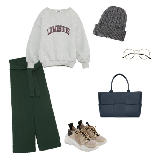 オーバーサイズのスウェットとスニーカー、ニット帽を使ってスポーティーに仕上げつつ、綺麗目なグリーンパンツで季節感をプラスさせました。カジュアルなアイテムを掛け合わせても子供っぽくならないのは、「ザ・アルコトート」のイントレチャートだからこそです。さらに、メガネを取り入れることで知的さと抜け感が加わり、バランスの取れた大人カジュアルに仕上がります。リラックスした大人の休日スタイルにぴったりなコーディネートです。