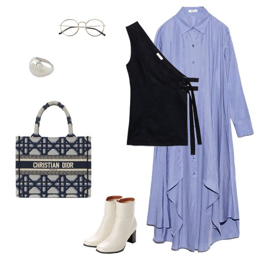 ブルーのロングシャツワンピースにブラックのアシンメトリートップスをレイヤードし、ホワイトのショートブーツを合わせたモードな秋スタイルのコーディネートです。そこに「ブックトート」をプラスすることで、全体のカラーが引き締まり、知的で洗練された印象を与えています。読書の秋にぴったりな美術館巡りや、シティホテルでのランチなど、落ち着いた大人の秋のお出かけシーンにおすすめの組み合わせです。