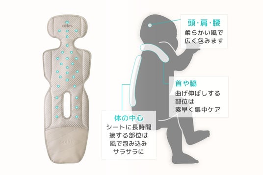 シート内部に配置された空気孔(エアホール)は、部位ごとに個数や大きさを変えて設計しています。温度変化に敏感なお子様の体温を急激に低下させることなく、やさしい風で快適な状態を保ちます。