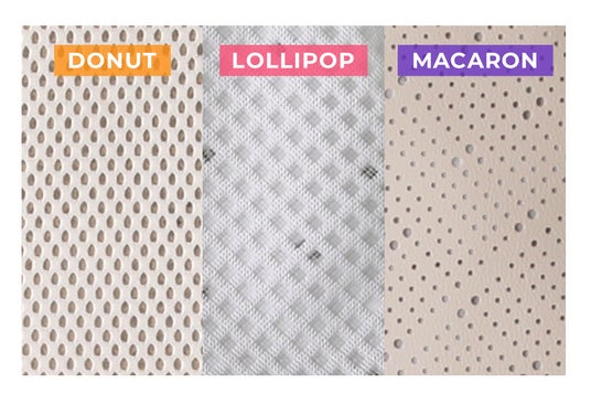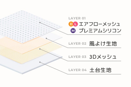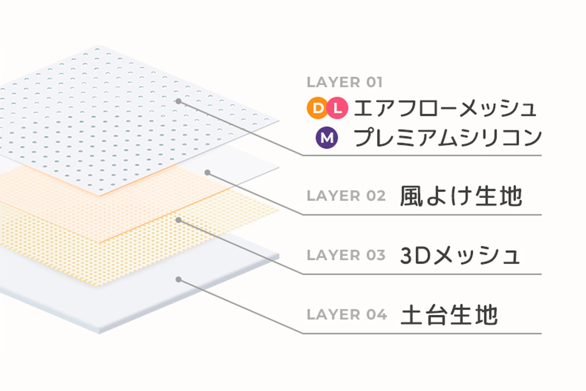 汗を軽減する4層構造の3Dメッシュ生地を採用し、デリケートなお子様の肌にもやさしい使用感を実現しています。最新モデルではメッシュサイズを大きくし通気性を向上させ、より効率的に熱を逃します。