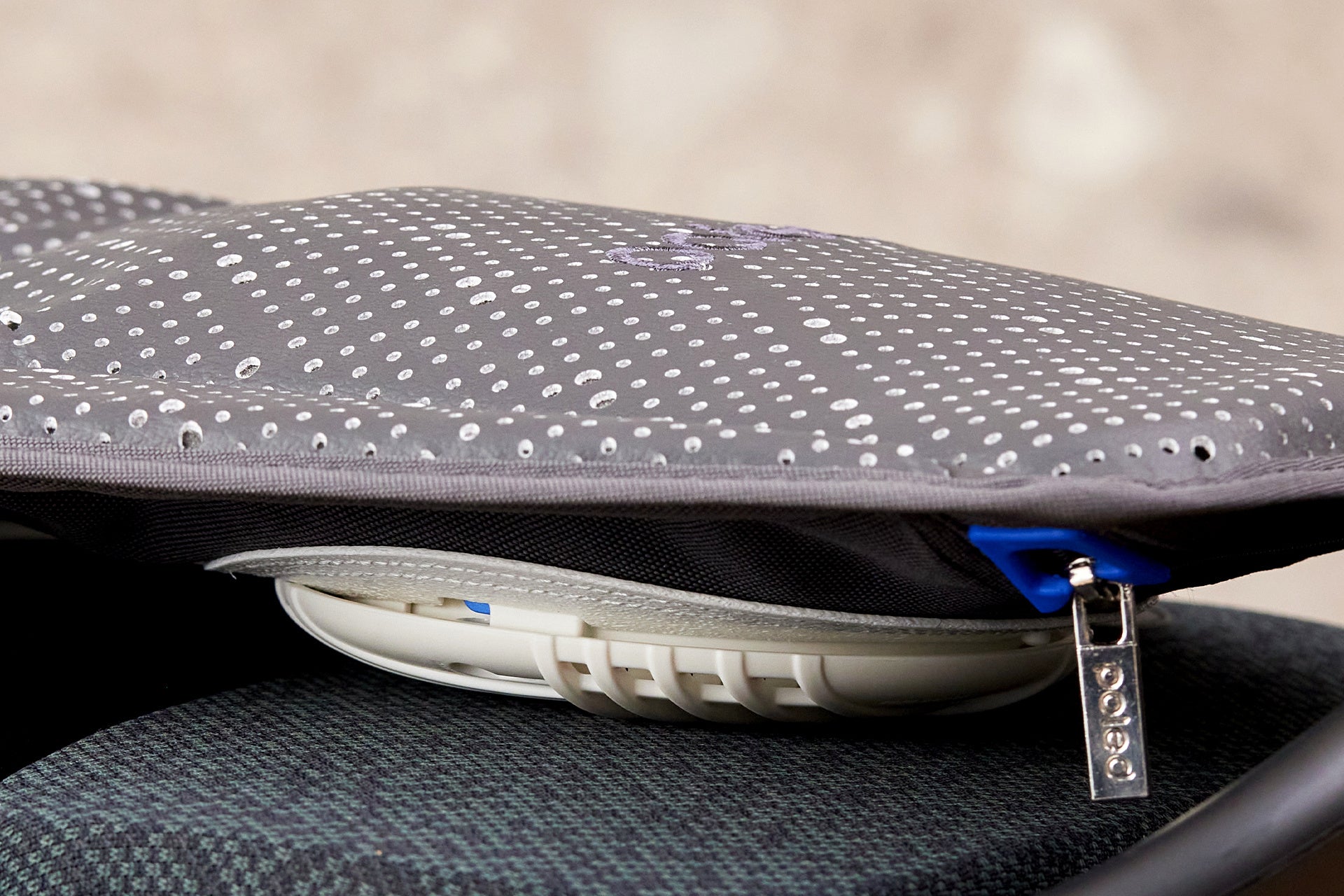 エアラブはモバイルバッテリー駆動の送風機付きクールシートです。足元裏側に設置されたファンが外気を吸い込み、シート内部のエアホールからやさしい風を排出することで、赤ちゃんの体温を適切に維持します。
