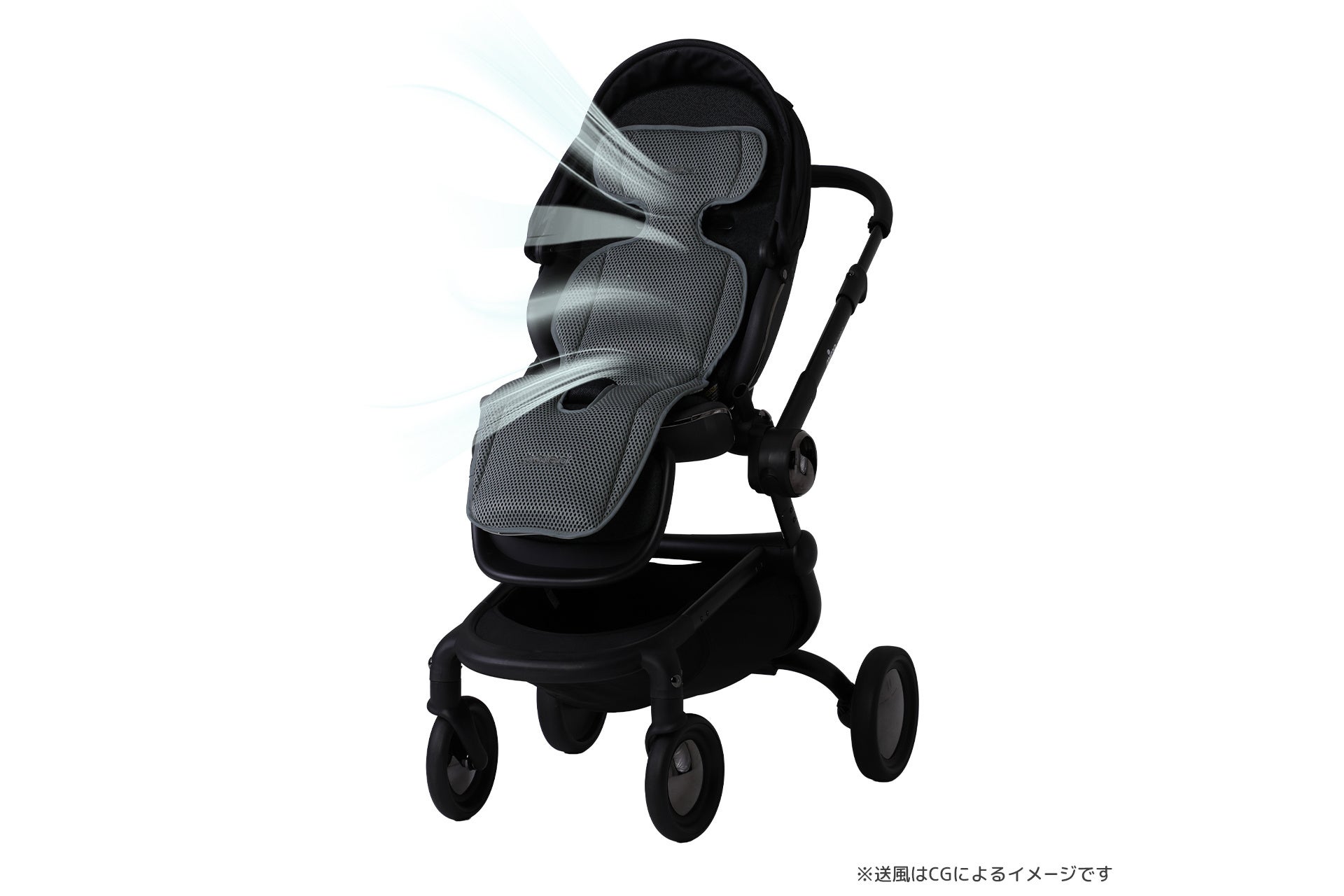 ベビーカーやチャイルドシート、バウンサーなど、さまざまなキャリアに対応。最新モデルではファンのグリル(蓋)形状を変更し、ファン側面にも吸気口を設けることで、フットレストが長いベビーカーでも外気を取り込みやすくなりました。