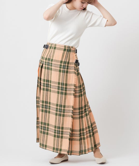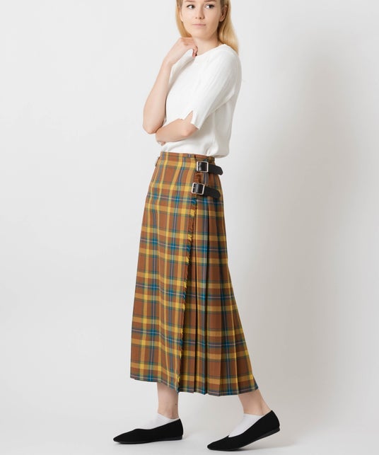 ベルトで留めて着る、 時代に左右されないクラシカルなキルトスカートより