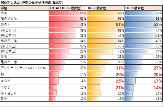 シック・ジャパンが行った調査によると、20~30代の女性を中心に、ボディパーツにおいて除毛・剃毛を行う部位が広がり、ケアの頻度も高まっていることが分かりました。