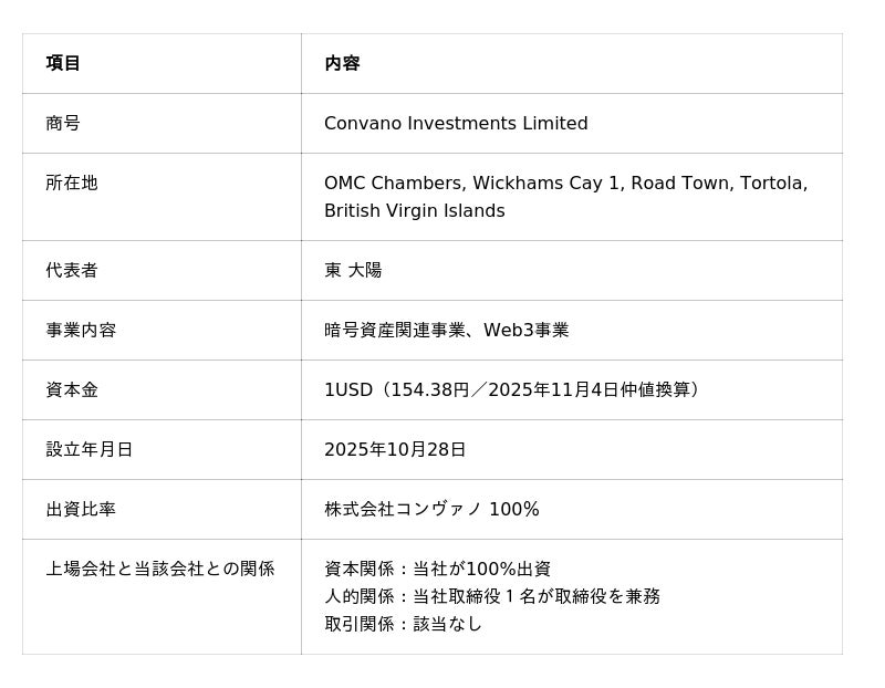 株式会社コンヴァノ(本社:東京都渋谷区、代表取締役社長:上四元 絢、証券コード:6574)は、2025年9月22日に発表した「海外子会社設立に関するお知らせ」に関して、イギリス領ヴァージン諸島(BVI)に設立した新子会社の登記が完了したことをお知らせいたします。