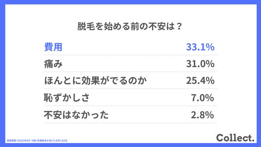 - 脱毛前の不安は「費用(33.1%)」が最多で、「痛み(31.0%)」「効果(25.4%)」が続く