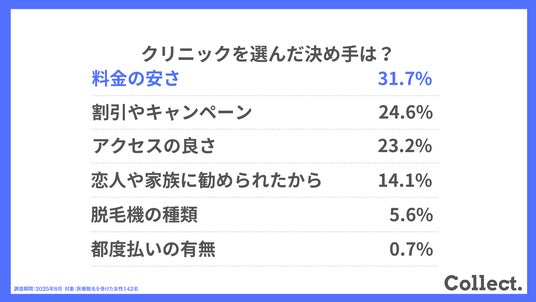 - クリニック選びの決め手は「料金の安さ(31.7%)」と「キャンペーン(24.6%)」
