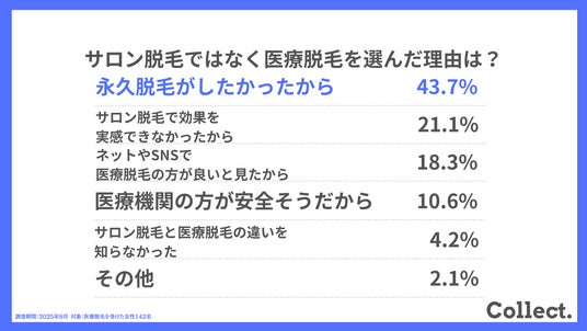 「永久脱毛をしたかったから(43.7%)」が最多でした。確かな効果や信頼性を求めて医療脱毛を選ぶ人が多く、情報収集の結果として医療脱毛を選択する傾向が強く表れています。