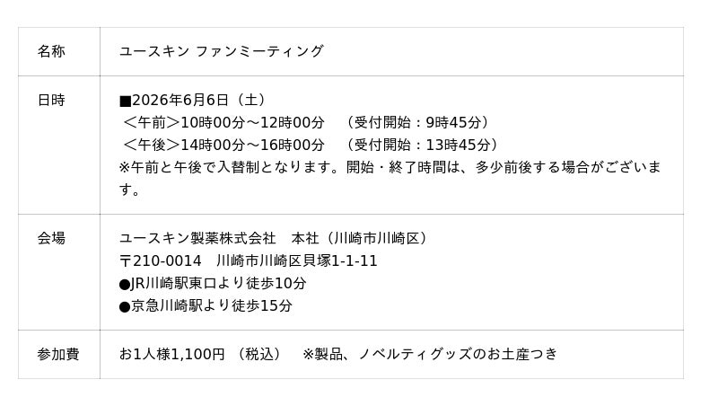 ユースキン製薬株式会社(本社:川崎市川崎区、代表取締役社長:野渡毅之)は、ユースキン製品のファンの皆さまと気軽に語り合うイベント「ユースキン ファンミーティング」を2026年6月6日(土)ユースキン製薬本社(川崎市)にて開催します。