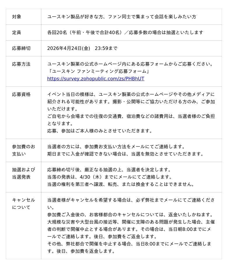 今年も、“まだお会いしたことのないユースキンファンの皆さまとお会いして話をしたい!” と考え、「ユースキン ファンミーティング」の開催を決定いたしました。当日はユースキン製薬の社長、社員が参加し、ご愛用のユースキン製品に対するご意見・感想をファンの方と気軽に話せる場にしたいと考えています。皆様のご参加を心よりお待ちしております。
