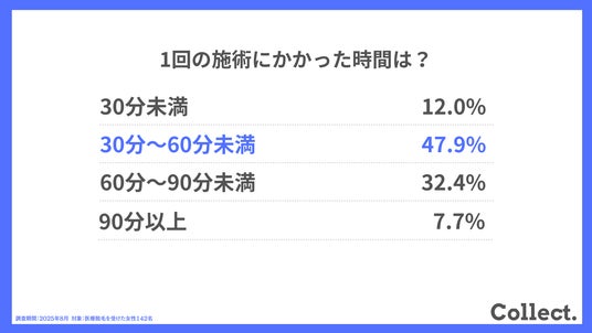 30~60分未満が約半数を占める結果となりました。仕事や学業と両立したい方にとって、強力な脱毛機器でスピーディーな脱毛を実現しているのは医療脱毛の強みです。