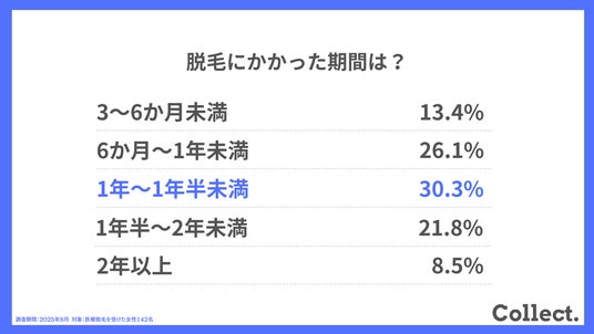 - 脱毛完了までの期間は1年~1年半未満が30.3%で最多。短期間での効果が明らかに