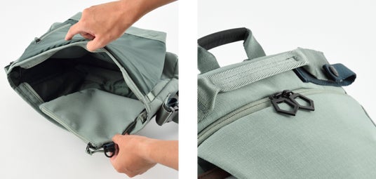 バッグ内部には着脱可能なポーチを装備。装着時は内装ポケットとして使用でき、取り外せば旅先などで活躍する独立したポーチとして使用が可能。ファスナーの引き手には、指を掛けて開けやすい穴あきデザインを採用しています。