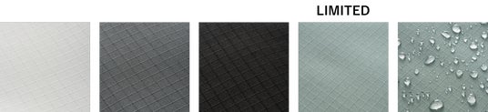 ※左からライトグレー、ダークグレー、ブラック、限定色アッシュグリーンの4色展開と撥水のイメージ。※撥水加工は防水加工と異なるため、長時間の雨水では水が染みこむ場合がございます。