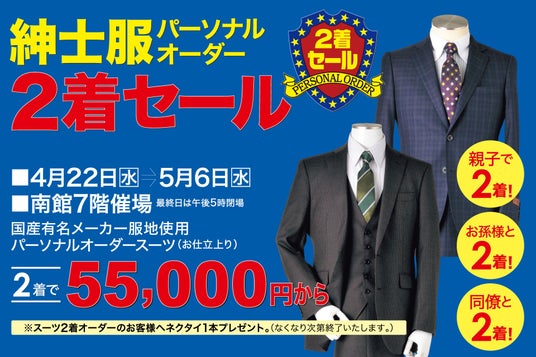 佐賀玉屋(本社:佐賀県佐賀市中の小路2-5、代表取締役社長 山越 悠登)は2026年4月22日(水)から5月6日(水)まで「紳士服パーソナルオーダー2着セール」を南館7階催場にて開催いたします。