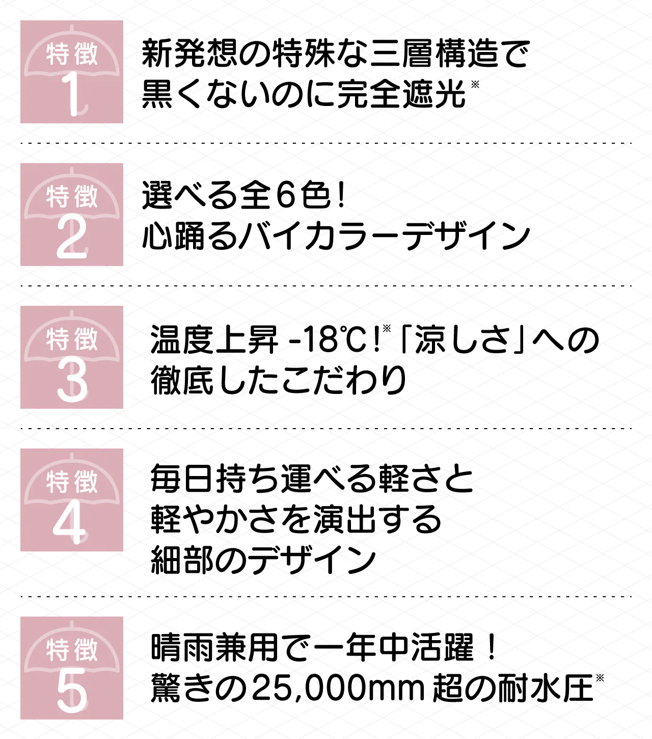 第三者機関の生地試験でも遮光率・UVカット率100%※を実現し、高級日傘と比べても遜色のないスペックになっています。