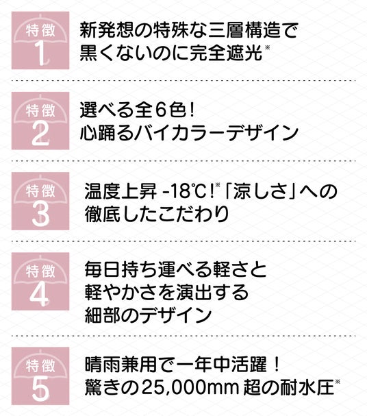 ※各数値は生地の状態での測定値であり、傘本体の性能を表す数値ではありません。また、傘の構造上、縫い目や刺繍部分など、生地以外の箇所からは光が漏れることがあります。
