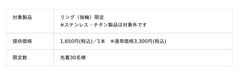 今回のキャンペーンでは、限定30名様に限り、通常1本3,300円(税込)の新品仕上げを1本1,650円(税込)でご提供いたします。金、プラチナ、シルバーなど様々な貴金属に対応しており、長年眠っていた指輪も、日常に寄り添ってきた指輪も、熟練職人の手によって本来の美しい輝きを取り戻します。