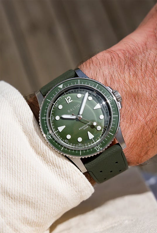 「Aquascaphe MK2」は、前作のサンドイッチダイヤルを廃し、立体的なルミキャストインデックスを新採用。厚みのあるインデックスと太く面取りされた針が、暗所でも確かな視認性をもたらします。また、ダイヤルカラーはグロッシー仕上げのブルーとグリーン、そして粒子感を強調したグレイン仕上げのグレーとウォームシルバーの4種類。カラーと質感の違いにより、シーンや好みに応じた表情を選ぶことが可能に。ケースはこれまでの39mm径から、37mmと39.5mmの2サイズ展開へと進化。手首のサイズや着用スタイルに合わせて選択できる柔軟性を備えました。さらに、クラウンガードを新設し、ケースの存在感と堅牢性を強化。仕上げも従来の円形ブラッシングから垂直方向のヘアライン仕上げに変更され、よりシャープで引き締まった印象を与えます。