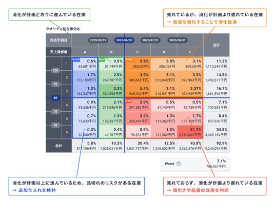 このため利用者は日々移り変わる在庫の特性(コンディション、リスク等)を適時に把握できます。さらに、把握した課題を改善するために必要な具体的なアクションを利用者に提示するUIとなっています。