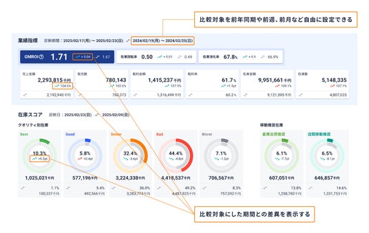 - 在庫の「健康状態」を可視化:小売経営に不可欠なKPI(重要指標)を一覧で表示し、在庫の全体像と課題のボトルネックを直感的なUIで瞬時に把握できます。特に、在庫1円あたりでいくら粗利益を生み出したかを示す「GMROI」を重視し、在庫回転率と合わせて追跡することで、安定的な利益向上とキャッシュフローの改善を可能にします