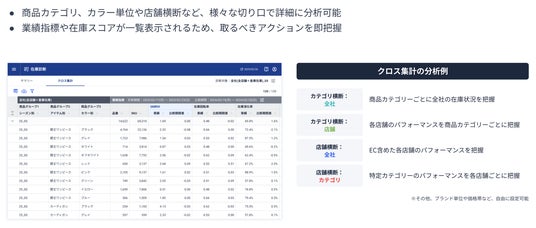 - 多角的な課題把握と早期対応:「クロス集計」機能を使うと商品カテゴリ、カラー単位、店舗横断など、様々な切り口で詳細な分析が可能です。クロス集計した在庫に関して、業績指標や在庫スコア(コンディション、リスク等の特性)が一元表示されるため、利用者は取るべきアクションを即座に把握できます