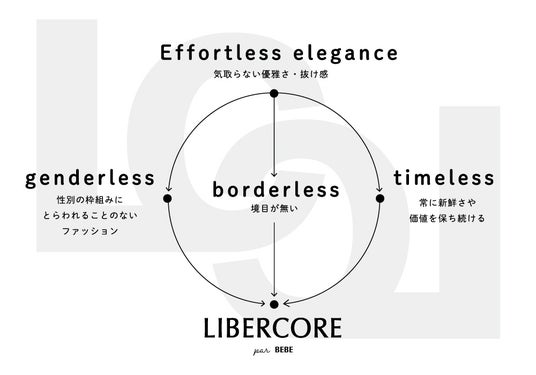 LIBERCORE par BEBE(リベルコア パル べべ)は、"着る人を選ばない" "自由な着こなし"を提案します。シンプルでナチュラルなテイストだからこそ、シルエットや穏やかなディテールにこだわった、ラグジュアリー感のあるライフスタイルウェアブランドです。