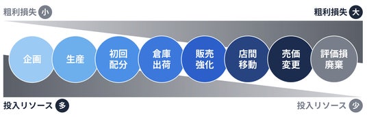 当社フルカイテンは、小売企業ののMD(マーチャンダイザー)やDB(ディストリビューター)、SV(スーパーバイザー)といった本部(本社)の担当者が最小の在庫で粗利益を最大化させるのを支援するさまざまなプロダクトは提供してきました。小売をはじめとした在庫ビジネスには、業務フローの各工程において下図のような投入リソース(人的、資金的な経営資源)と粗利毀損の関係があります。