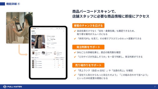 在庫最小化・粗利最大化の実現を支援する在庫分析クラウド『FULL KAITEN』を展開するフルカイテン株式会社(本社・大阪市福島区、代表取締役・瀬川直寛)は、小売企業の店舗スタッフの業務を支援し、店舗における業務効率化と売上最大化を支援する新サービス「FULL KAITEN〈ストアエージェント〉」の提供を開始します。FULL KAITEN〈ストアエージェント〉は店舗スタッフが店頭で「今日何をすれば売上が増えるか」を明確に提示することで、店舗運営の属人化を解消し、常に鮮度の高い売り場づくりを支援します。