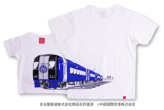 名古屋鉄道創業130周年を記念して登場した白と青が反転塗装になった「ブルーミュースカイ」がモチーフ。「空と海」をイメージした青色がメインカラーの「ブルーミュースカイ」をTシャツのフロントからバックにかけて色鮮やかにデザインしました。バックプリントに描かれた車両の影には「130TH ANNIV」の文字が隠れているのもポイントです。