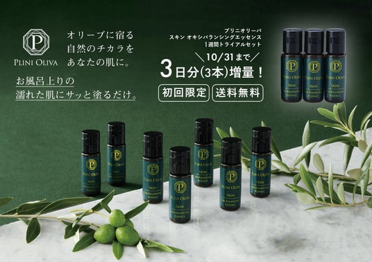 日本オリーブ株式会社(所在地:岡山県瀬戸内市牛窓町、代表取締役社長:服部芳郎)は濡れた肌にオリーブオイルを塗布することで保湿効果が1.2倍になることを研究により明らかにしました。研究の成果を実感してもらうべく、お風呂あがりの30秒でサポートするスキンケア「プリニオリーバ スキン オキシバランシング エッセンス」が2025年10月1日から、「トライアルセット」を1ヶ月限定で特別増量販売いたします。