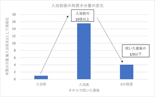 タオルドライ後の数分で角質水分量は激減します。お風呂あがりの肌は大変乾燥しやすい状態にあります。その理由は、洗浄によって汚れと一緒に皮脂膜も落ちてしまい、肌を保護する油膜がなくなってしまうからです。また、入浴中に細胞間脂質や水溶性保湿成分が失われ、肌自身が水分を保持する能力が低下してしまいます。入浴中は、肌のバリア機能を担っている皮脂膜や細胞間脂質が奪われるため、多量の水分が入ってきて角質細胞が膨潤します。角質水分量を測定した結果、入浴後にタオルで表面の水分を拭き取ると、直後はまだ過剰な水分が残っていますが(入浴前の15倍以上)、わずか5分で角質水分量は直後と比べて3分の1以下に減少することがわかりました。