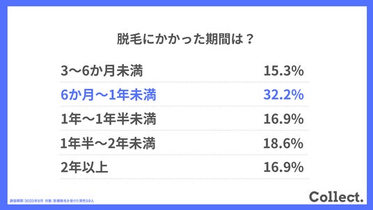 「6か月~1年未満(32.2%)」が最も多く、約3人に1人が1年以内で施術を終えている結果となりました。「施術を受けた回数は?」という質問で「4~6回(32.2%)」が最多だったことから、毛周期に合わせて2か月に1回程度通院している方が多いことが分かります。