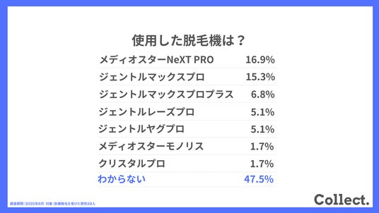 最多は「わからない(47.5%)」でしたが、認知度の高い「メディオスターNeXT PRO(16.9%)」「ジェントルマックスプロ(15.3%)」が続きました。効果や痛みは機器によって異なるため、事前の確認が重要です。