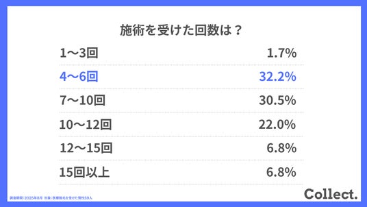 有効回答の約9割が12回以内で施術を終えていることが分かりました。効果には個人差がありますが、12回前後が一つの目安といえるでしょう。