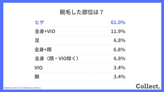 「ヒゲ(61.0%)」が圧倒的に多く、次いで「全身+VIO(11.9%)」「足(10.2%)」「全身+顔(8.5%)」「全身(顔・VIO除く)(6.8%)」と分散しました。
