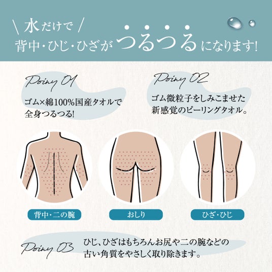 「ゴムポンつるつる」は、タオルの繊維一本一本に特殊な微粒子のゴムをコーティングした、新感覚のピーリングタオルです。 消しゴムが汚れを巻き取っていく原理を応用し、水に濡らして優しくなでるだけで、古くなった角質や背中のザラつき、ひじ・ひざ・かかとのガサガサをスッキリと取り除きます。石鹸を使わなくても「水だけ」でお肌がツルツルになるその実力は、テレビ番組やSNSでも度々話題となり、多くのお客様にご愛用いただいております。