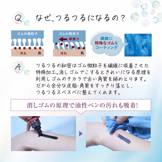 ・ゴムの吸着力と摩擦力:特殊ゴム加工が古い角質をキャッチし、お肌を傷めず優しくピーリング。