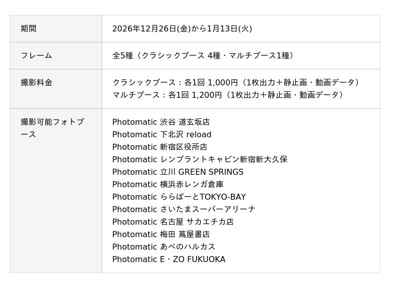 キタムラ・ホールディングス グループのピックハイブ株式会社(本社:東京都新宿区、代表取締役社長 兼 COO:大迫 由典)が運営するセルフフォトブランド「Photomatic(読み:フォトマティック)」は、2025年12月26日(金)から2026年1月13日(火)の期間中、大人気スクールアイドルプロジェクト『ラブライブ!サンシャイン!!』とのコラボレーションフレームをPhotomaticの全国12カ所のフォトブースで発売します。