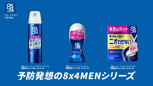 「8x4MEN」は、新たなタグラインに「汗に、ニオイに、予防発想。」を掲げ、「汗を気にせず、自分をだせる。」のメッセージとともに、汗やニオイに悩んでいる方々を応援してまいります。