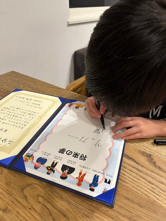 ・ それぞれのご家庭で色紙に夢や目標を書き込む時間を設け、保護者が証書と記念品を渡して子どもの成長を祝福