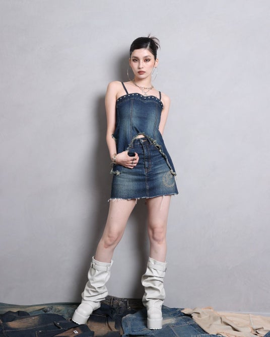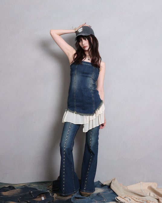 特に「フリルドッキングデニムキャミワンピース」や「スタッズオープンウエストフレアデニムパンツ」は、レイヤード次第で様々な表情を楽しめる主役級アイテムです。