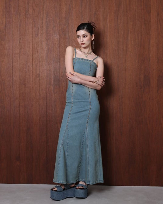 商品名:スタッズフレアデニムキャミワンピース価格 :16,600円(税込)カラー:アイスブルー、インディゴサイズ:S,M