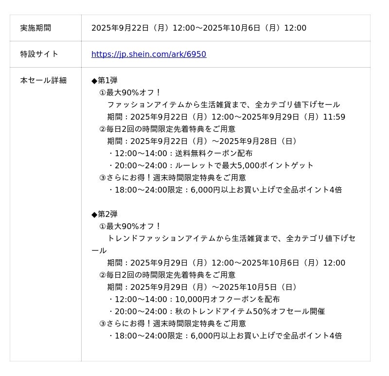この度SHEINは、日頃のご愛顧に感謝の気持ちを込め、年に1度のビッグセール「SHEIN 周年記念セール」を開催いたします。2025年9月22日(月)12:00~2025年10月6日(月)12:00までの期間限定で開催します。ファッションアイテムから生活雑貨まで、全カテゴリのアイテムを最大90%オフでゲットできるキャンペーンです。