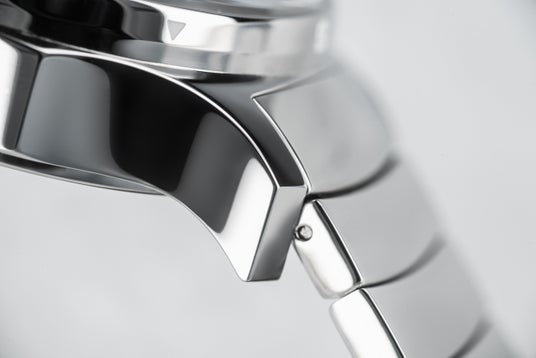 本モデルは、ケース・ブレスレット・文字盤・針に至るまで、すべてを鏡面ポリッシュ仕上げで統一。