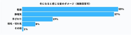 また、「冬になると感じる髪のダメージはありますか?」という質問には、「乾燥」が最も多く、次いで「静電気」があがりました。多くの方が、冬場の乾燥により髪の状態が変化することを実感しているようです。